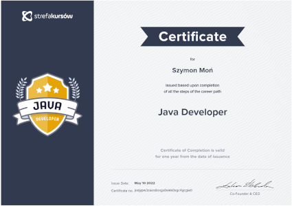 Certificate for completing all courses and passing the exam "Career paths: Java Developer".