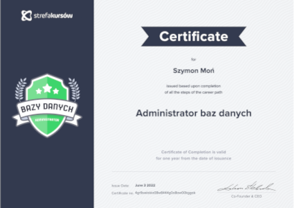 Certificate for completing all courses and passing the exam "Career paths: Database Administrator".
